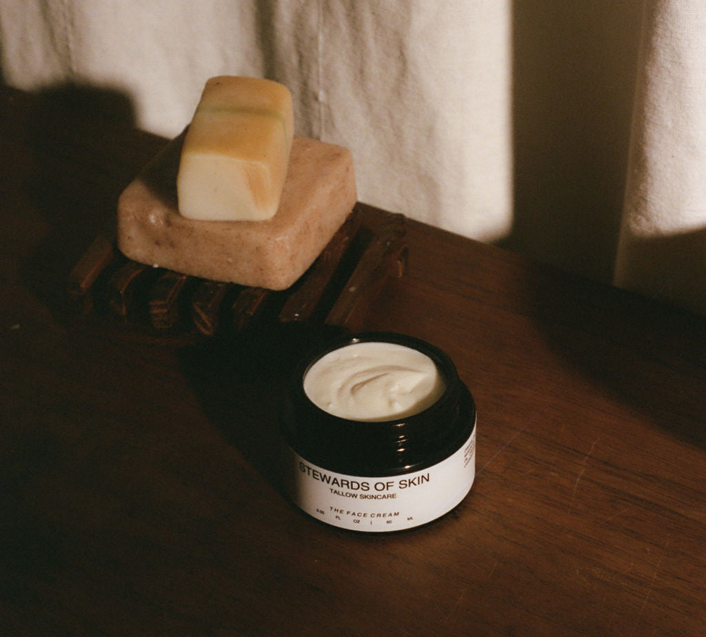We begin with tallow. Evidence of its use in skincare can be found across ancient cultures, from ancient Rome to Egypt to China. A highly compatible ingredient to our human skin that initiates deep absorption and effective healing, it is sourced from ethically raised, organic, grass-fed and grass-finished cattle.